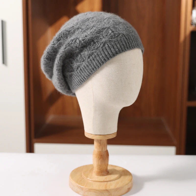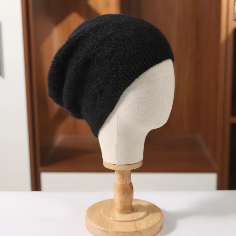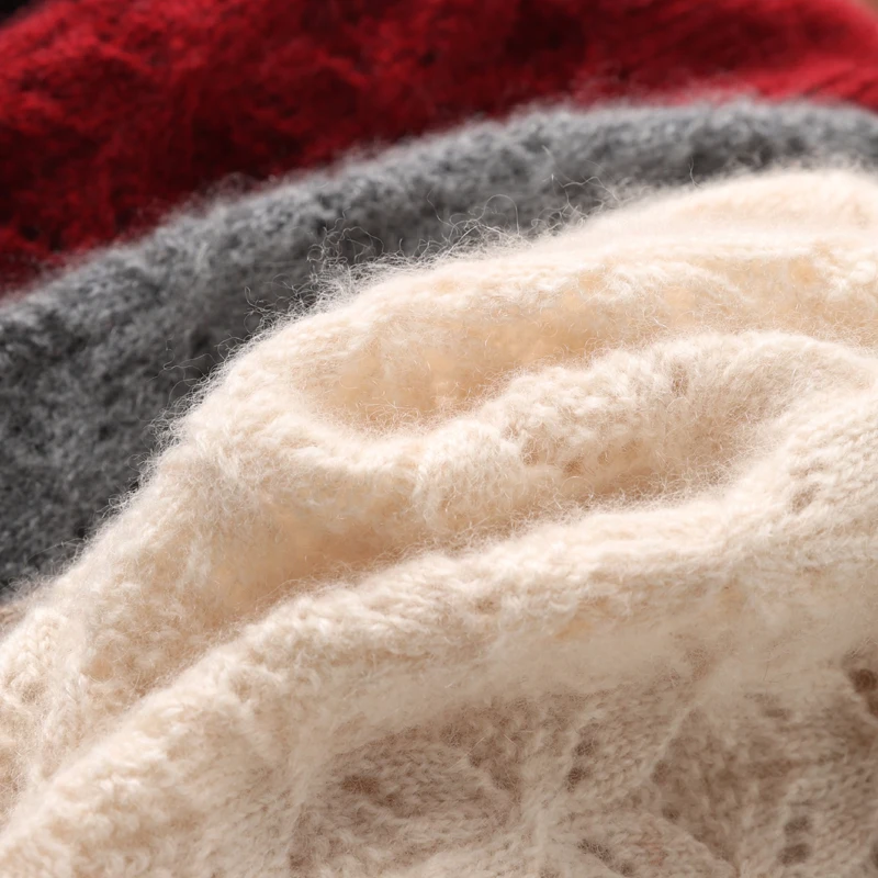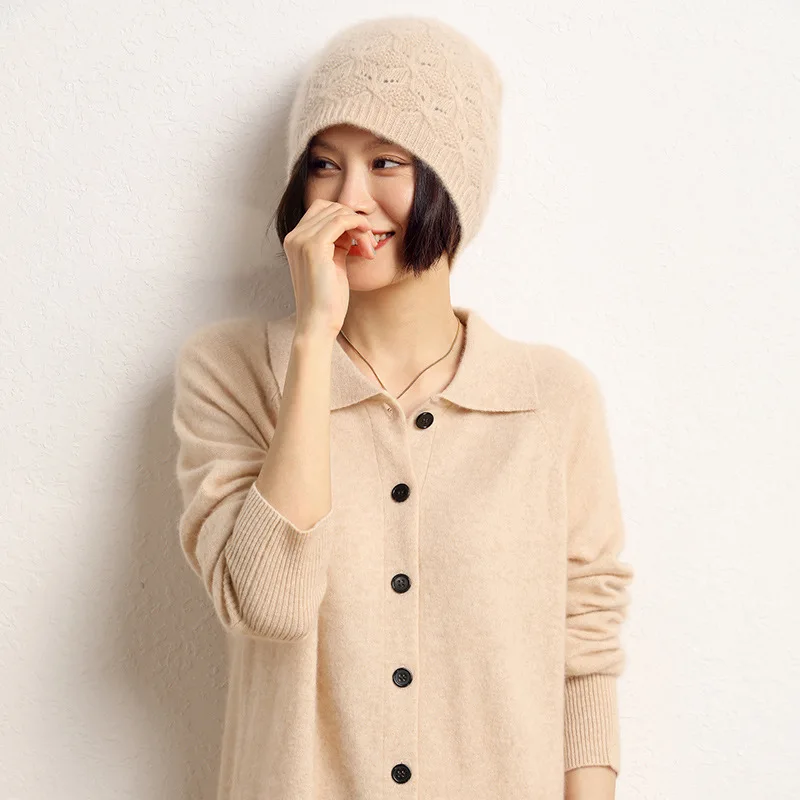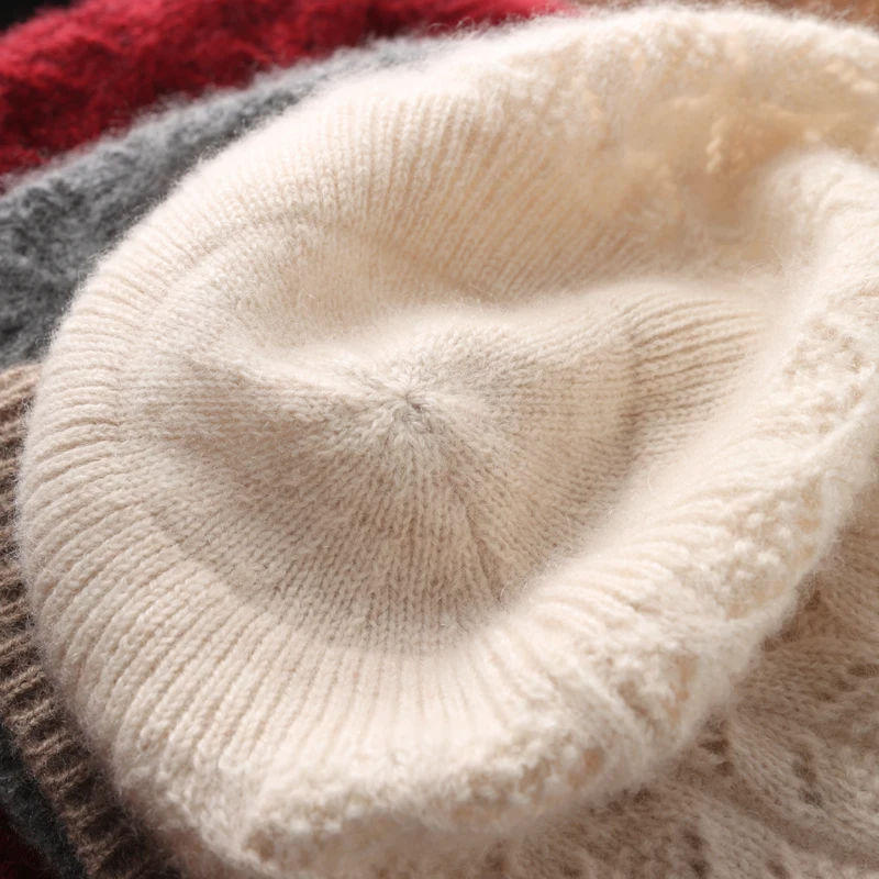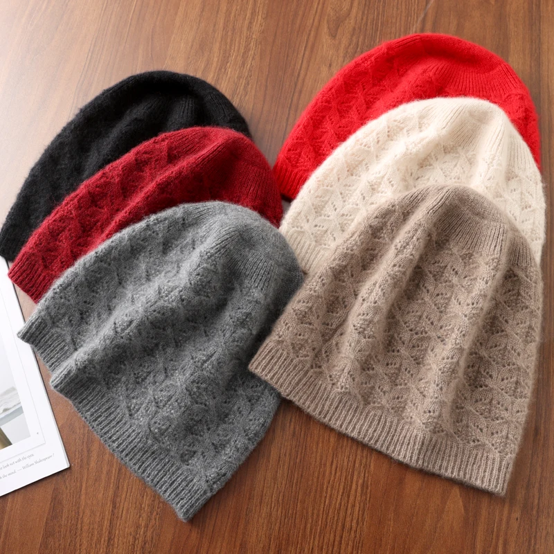 100%Pure Wool Women’s Knit Beanie Winter Autumn Warm Soft Fashion Pullover Cap Hollow Hook Flower Luxury Wollen Skullies Cap
