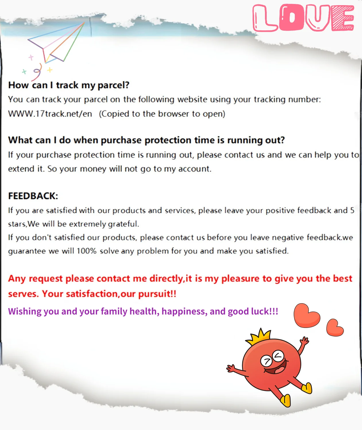 *You can submit refund requests within 15 days after the guaranteed period for delivery (45 days) has expired. You can do it by sending a message on Contact Us page