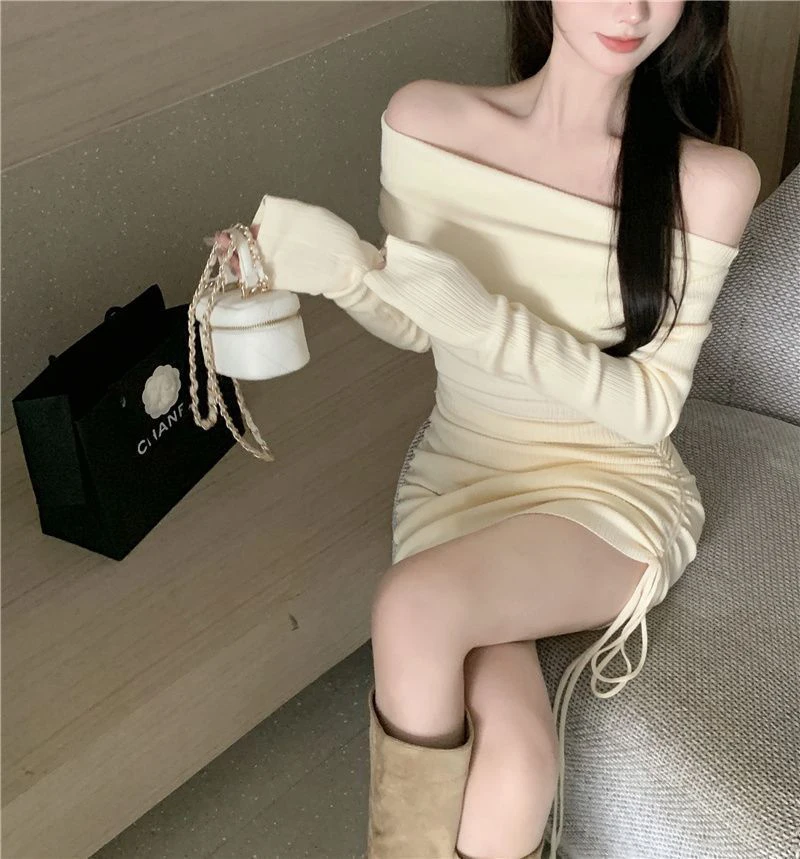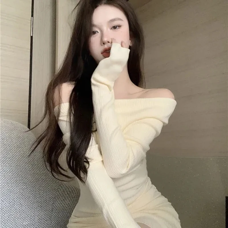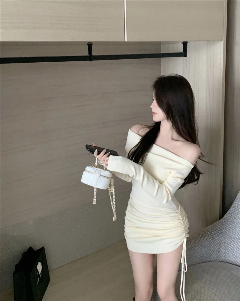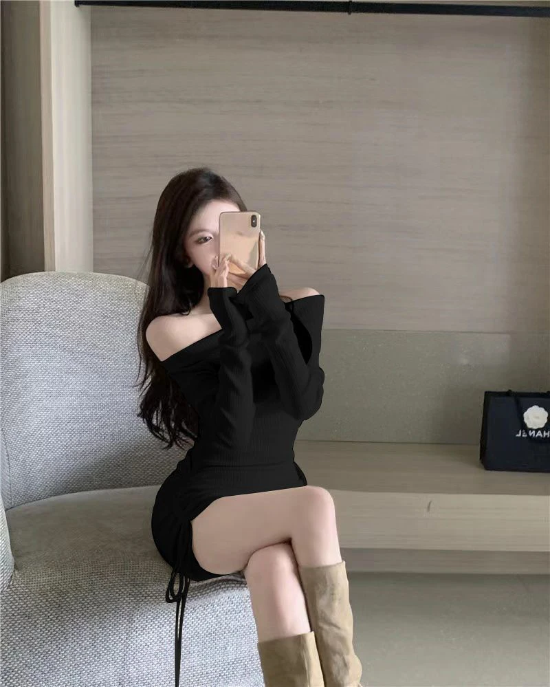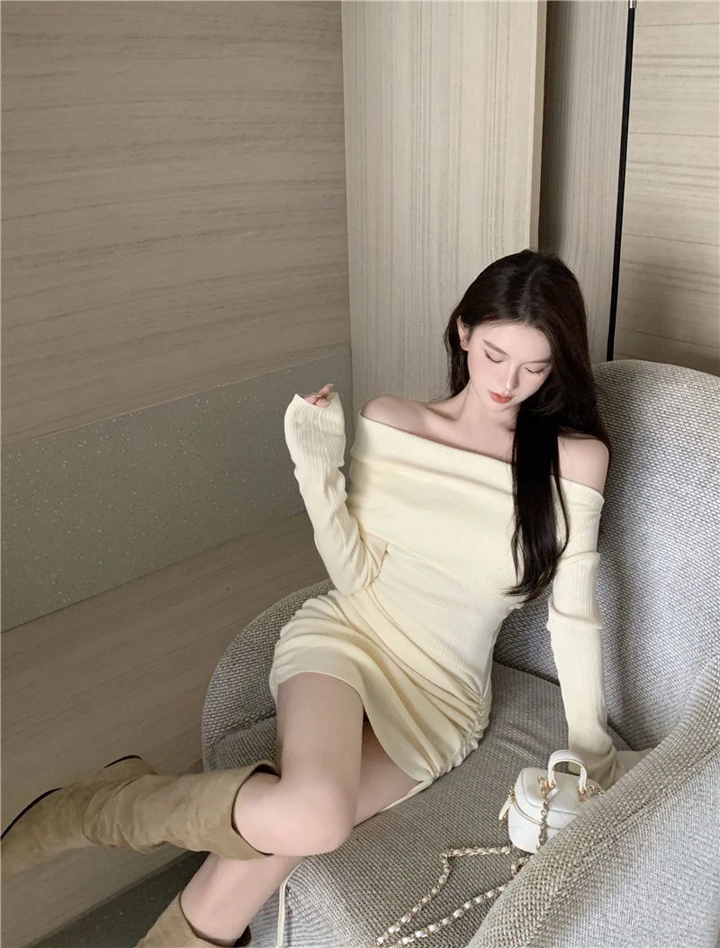 Slash Neck Strickkleid Frauen koreanische Langarm sexy Raffen Plissee schlanken Rock Herbst Winter solide elegante dehnbare Dame Kleid