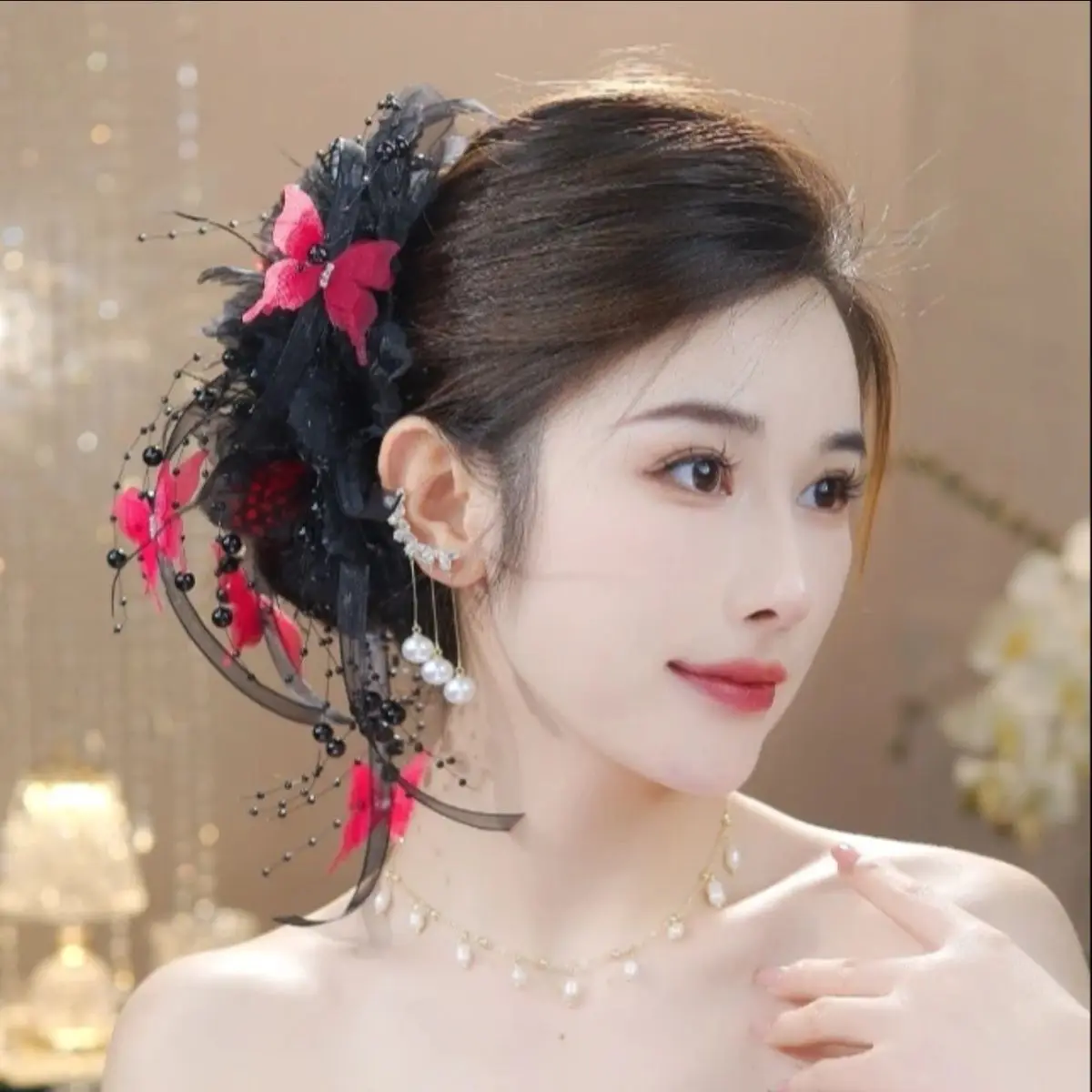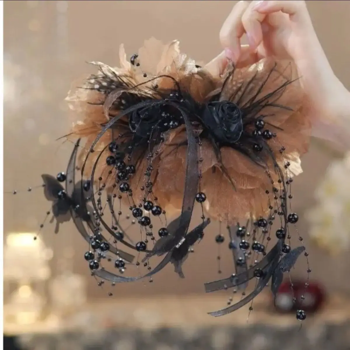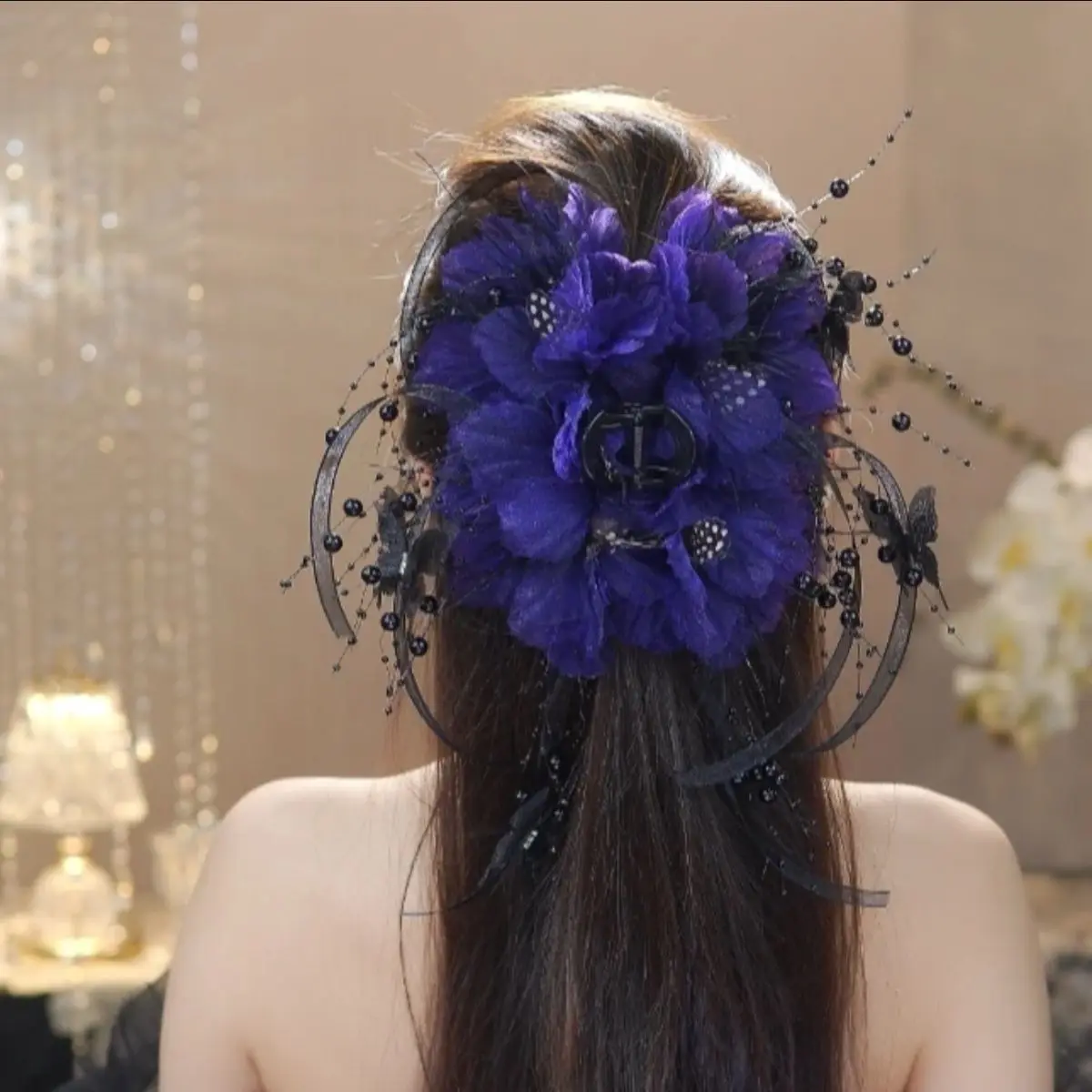 Women Luxury Autumn Winter French Style Flower Bead Feather Tassel Hair Accessories Female Hairpin Shark Hair Claw Headdress